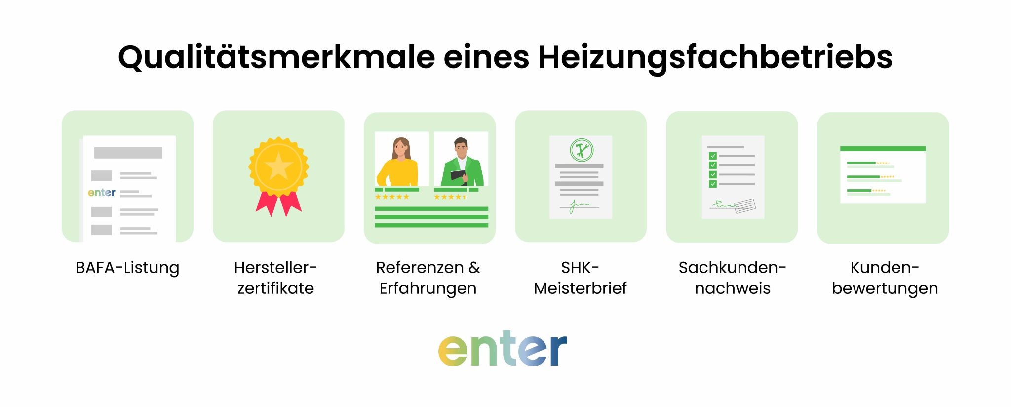 Als neutrale Marktplatz-Plattform sind wir nicht an bestimmte Hersteller gebunden und können Ihnen daher die objektiv beste Lösung für Ihre individuellen Anforderungen bieten. Unsere Partner verfügen über alle notwendigen Zertifizierungen, BAFA-Listung und nachgewiesene Erfahrung in der professionellen Heizungsmodernisierung. Jeder Betrieb wird vor der Aufnahme ins Enter-Netzwerk sorgfältig geprüft und muss kontinuierlich hohe Qualitätsstandards erfüllen.