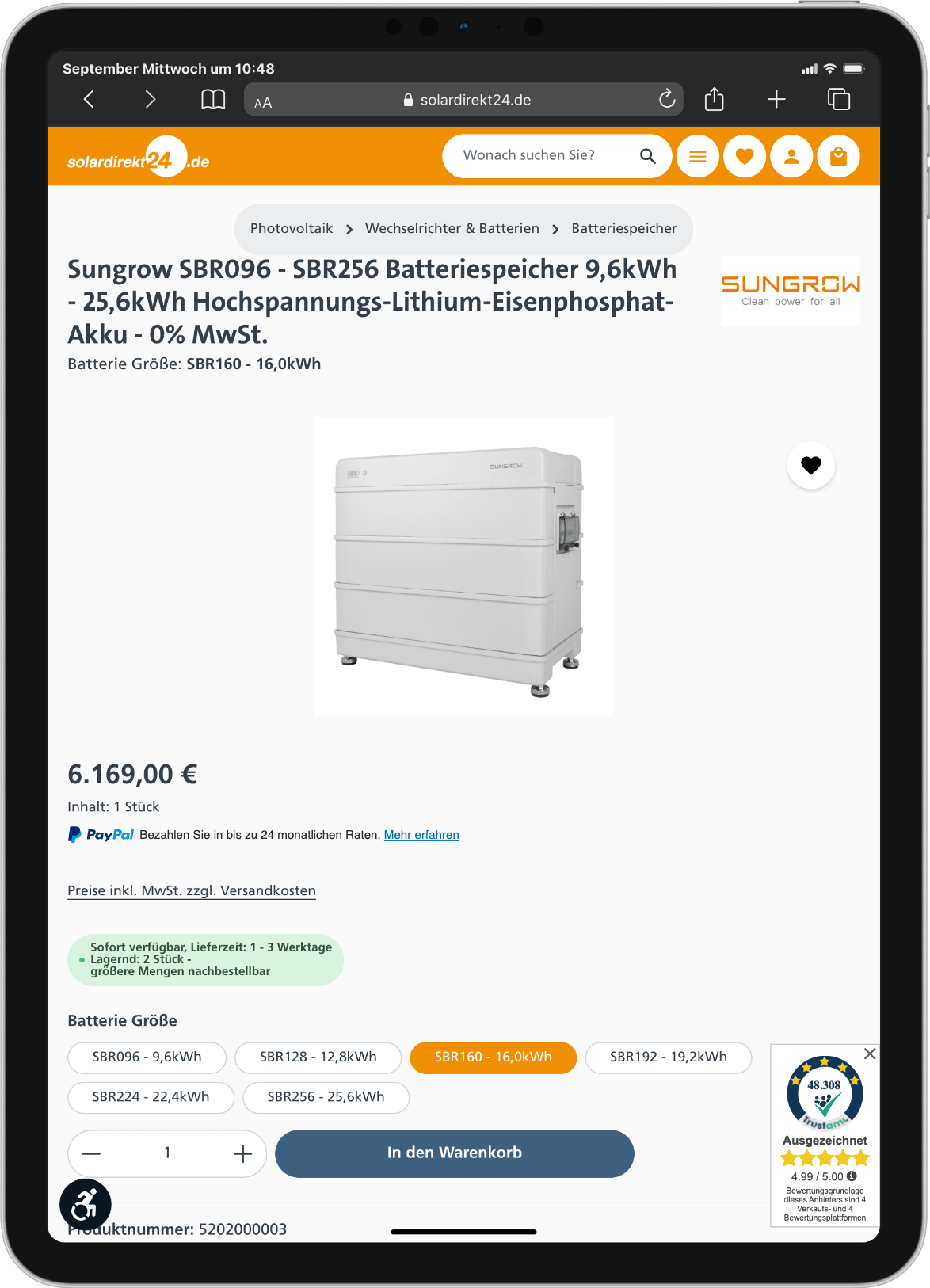 Der Sungrow SBR096 hat sich in zahlreichen Tests als echter Preis-Leistungs-Sieger etabliert. Als Produkt eines der weltweit gröĂten Wechselrichterhersteller kombiniert er modernste Technologie mit einem attraktiven Preispunkt. Besonders fĂŒr preisbewusste Hausbesitzer, die dennoch nicht auf QualitĂ€t und Leistung verzichten möchten, stellt dieser Stromspeicher eine ĂŒberzeugende Option mit hervorragendem Preis-LeistungsverhĂ€ltnis dar.